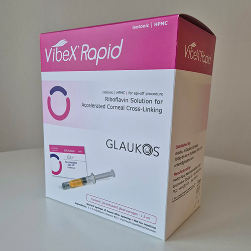 VibeX Rapid on markkinoiden nopein riboflaviini. Tiputusaika puolet normaalista eli vain 15 minuuttia. Ei sisällä dextrania, joten ei pienennä sarveiskalvon paksuutta. Imeytetään sarveiskalvolle epiteelin poiston jälkeen ja sarveiskalvo altistetaan KXL-laitteella UVA-valolle. Saatavana myös PiXL versiona paksummalle sarveiskalvolle. Toimenpide: kiihdytetty crosslinking keratoconuksen tai sarveiskalvon ectasian hoitoon. 0,1 % riboflaviini, saline, HPMC. Esiladattu ruisku. 10 x 1,5 ml.